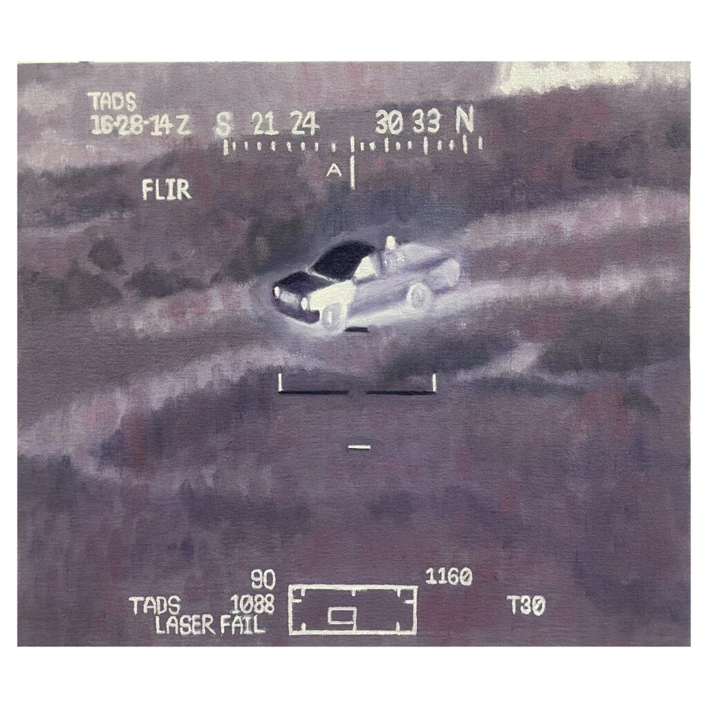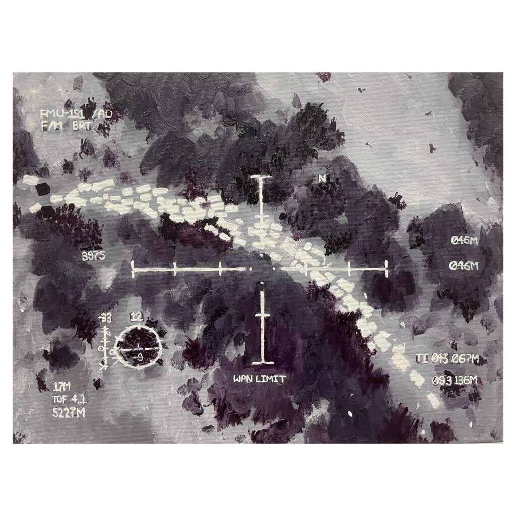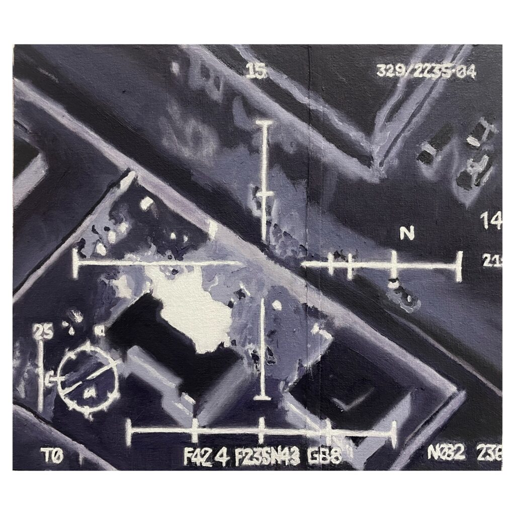 The largest and newest painting in my aerial thermometry series. I’ve been painting from thermal images and aerial photos, and looking at other forms of surveillance technology used in scientific and military applications. Where the first six paintings were small and each focused on a single image, this work features multiple images arranged across the surface. I have long been interested in “picture in picture” compositions in painting, having used the motif multiple times, and I keep returning to it. This type of composition seems relevant in an era so dominated by an array of screens with simultaneous displays. I have been drawn to the aesthetics of technology, including scientific and military, since I was a child. I used to draw detailed maps and battle scenes full of machinery and high-tech weapons as early as age 5. I have returned to this kind of visual language as an adult, where it has met my interest in politics and anthropology. I have been adapting imagery of landscapes, machines, medical science and archaeology to interrogate my beliefs and understanding of the world. The imagery in this painting references volcanic activity, military aircraft and airbases, thermometry, and space travel. It resembles the kind of multi-display screens in science fiction or a pinboard used by conspiracy theorists.