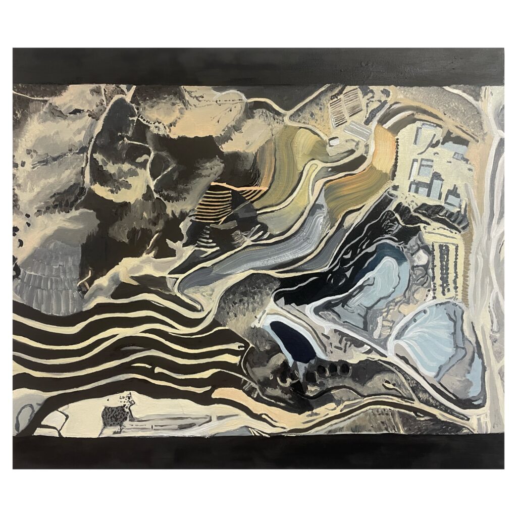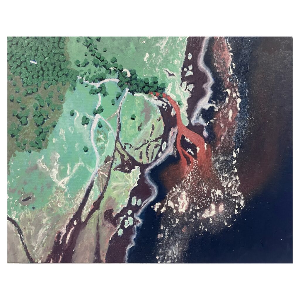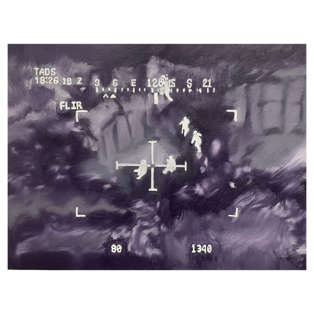 The largest and newest painting in my aerial thermometry series. I’ve been painting from thermal images and aerial photos, and looking at other forms of surveillance technology used in scientific and military applications. Where the first six paintings were small and each focused on a single image, this work features multiple images arranged across the surface. I have long been interested in “picture in picture” compositions in painting, having used the motif multiple times, and I keep returning to it. This type of composition seems relevant in an era so dominated by an array of screens with simultaneous displays. I have been drawn to the aesthetics of technology, including scientific and military, since I was a child. I used to draw detailed maps and battle scenes full of machinery and high-tech weapons as early as age 5. I have returned to this kind of visual language as an adult, where it has met my interest in politics and anthropology. I have been adapting imagery of landscapes, machines, medical science and archaeology to interrogate my beliefs and understanding of the world. The imagery in this painting references volcanic activity, military aircraft and airbases, thermometry, and space travel. It resembles the kind of multi-display screens in science fiction or a pinboard used by conspiracy theorists.