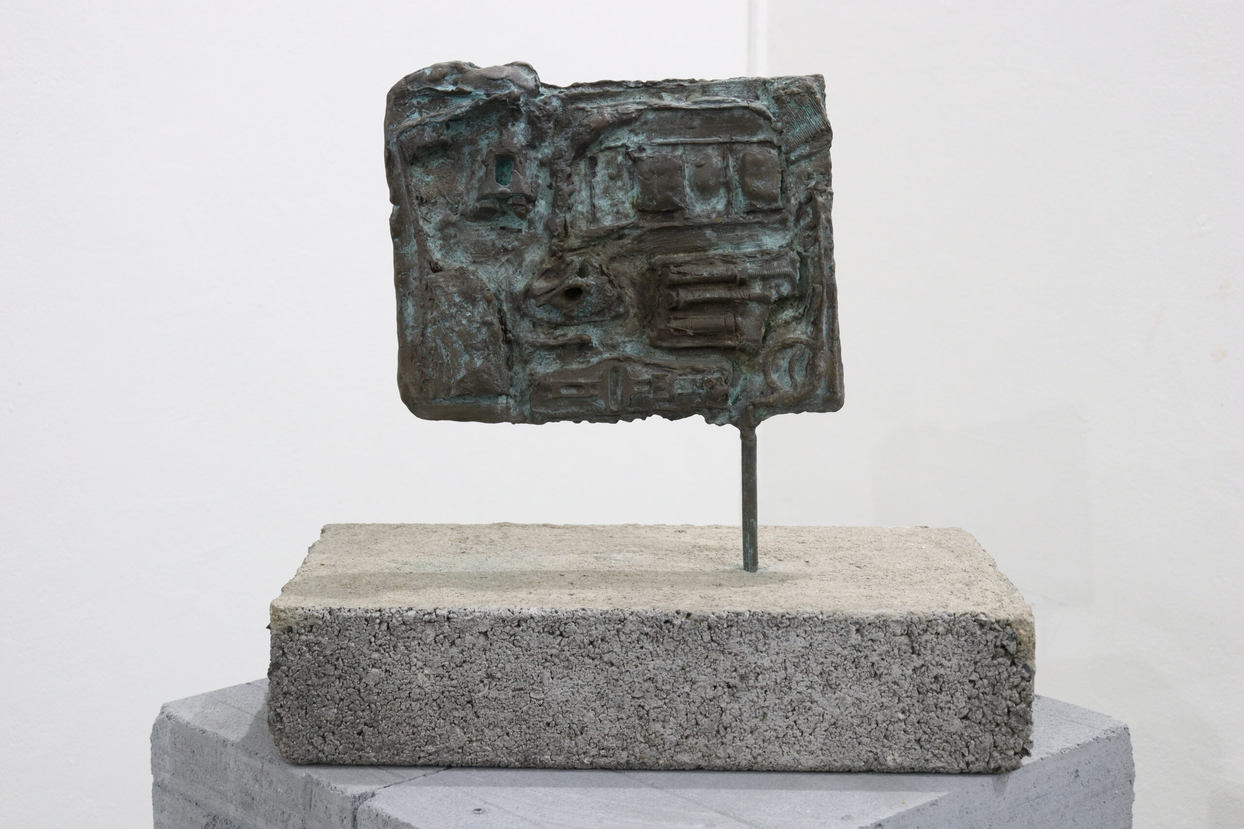This sculpture was an exercise in expanding my idea of what collage could be. Instead of the usual process of combining two-dimensional images on a flat surface, I cut out three-dimensional imprints and combined them on a sculptural surface. I pushed found objects into a rolled-out slab of soft clay, creating negative indentations and then cast them in wax, producing positive reliefs, before collaging them onto a larger wax substrate. I trimmed excess wax around the objects to avoid empty areas and turned it over to add texture to the back by melting areas with hot metal and painting on molten wax with a brush. I used this wax object to cast a bronze using the lost wax process. The rectangular shape reminded me of a flag once it came out of the plaster, and so I gave it colour by patinating it, welded it onto a stick of bronze to act as a flag pole and planted it in a concrete block. The piece is an exploration of collaged textures and a sense of heaviness. It has an industrial and aged feel. The work occupies a similar area of exploration as my 2D work, as it experiments with layers, accumulation of disparate and alien objects and the fine line between flatness and depth.