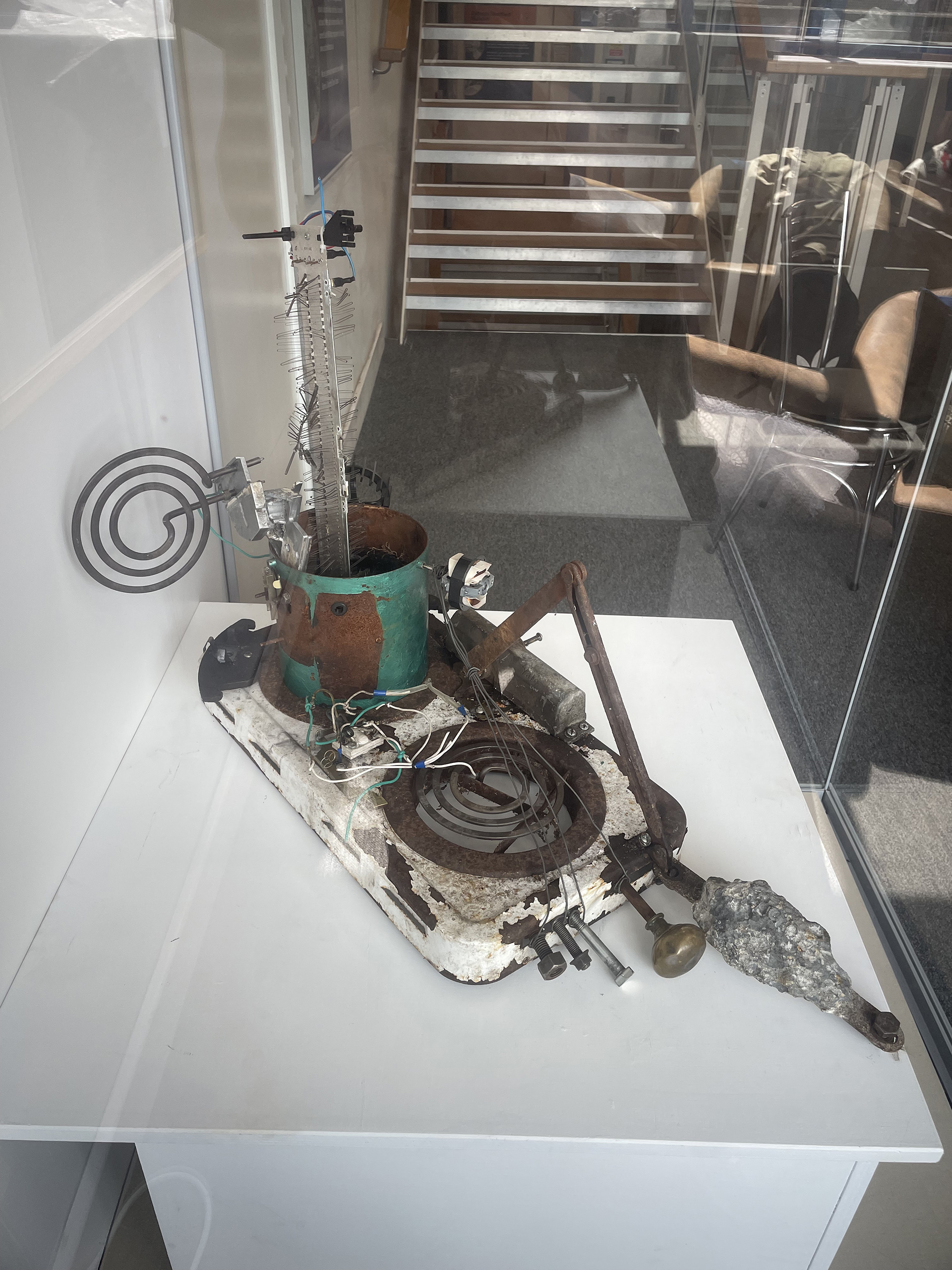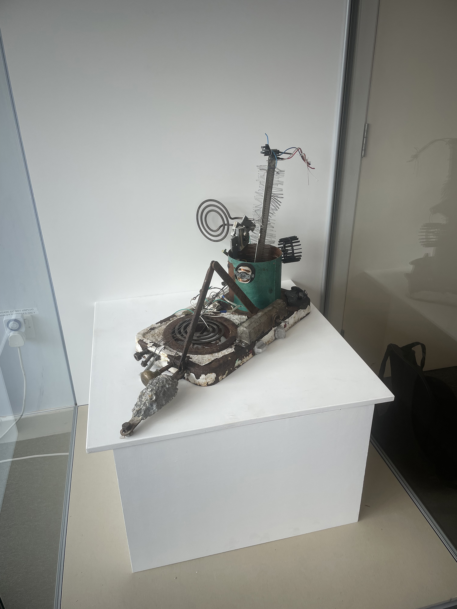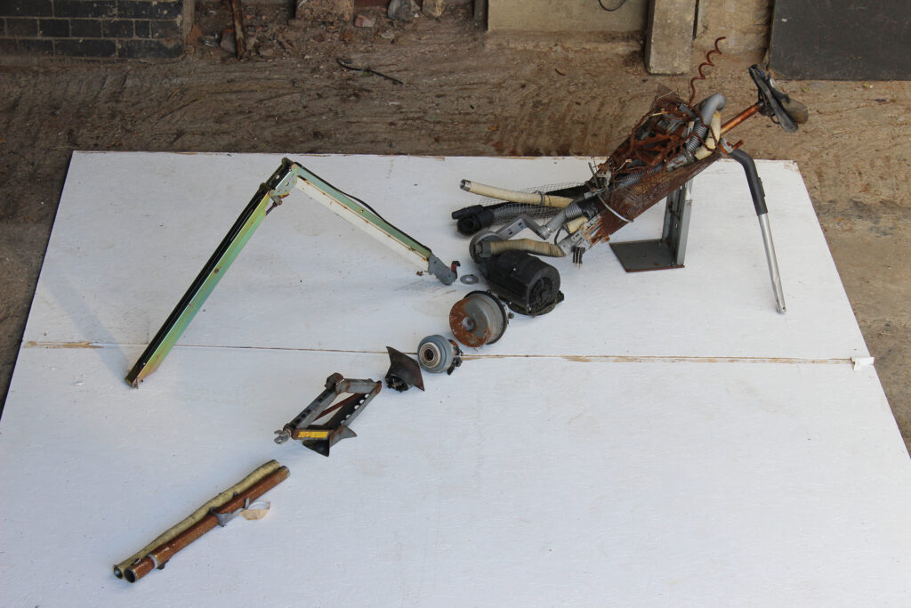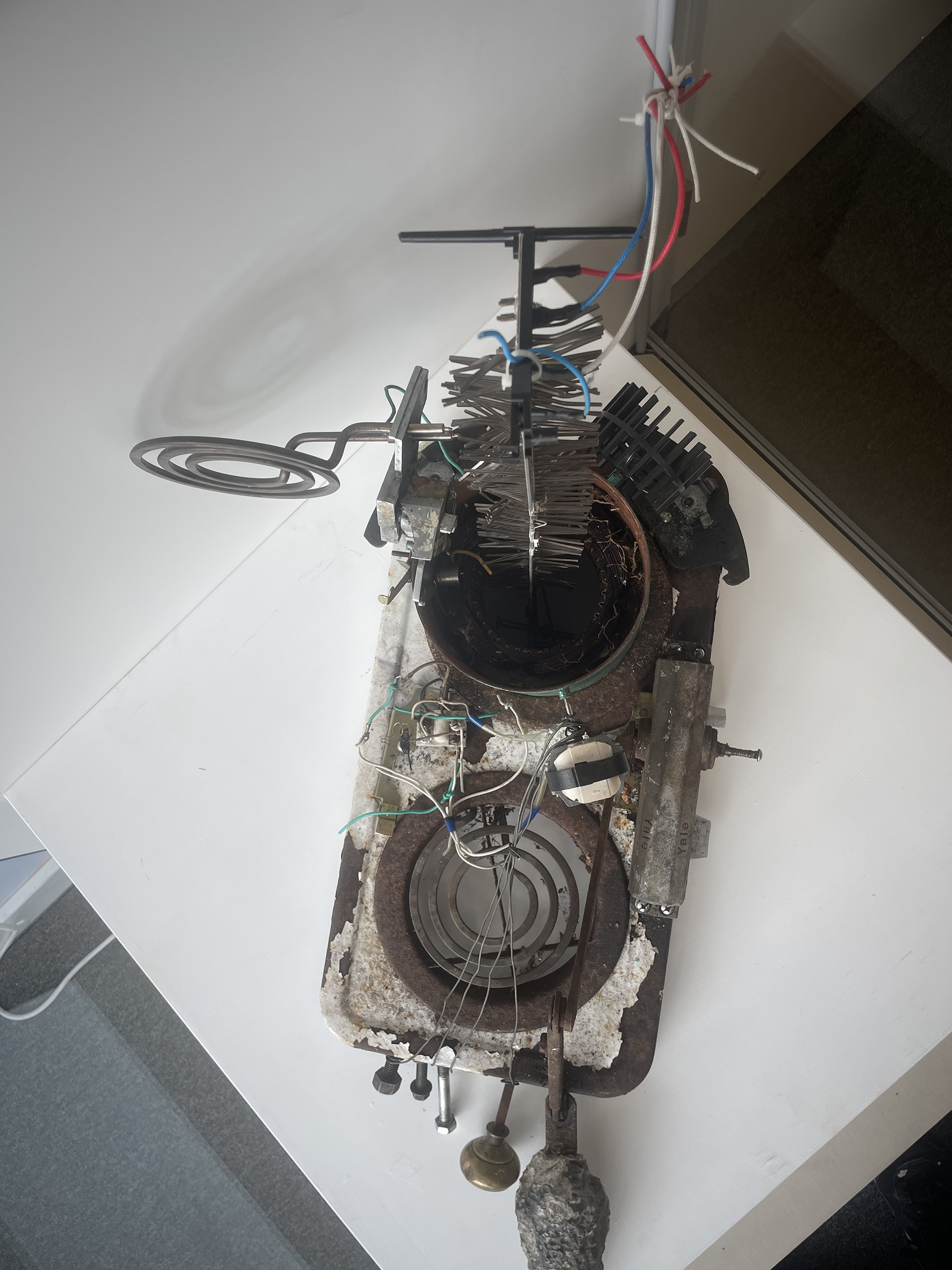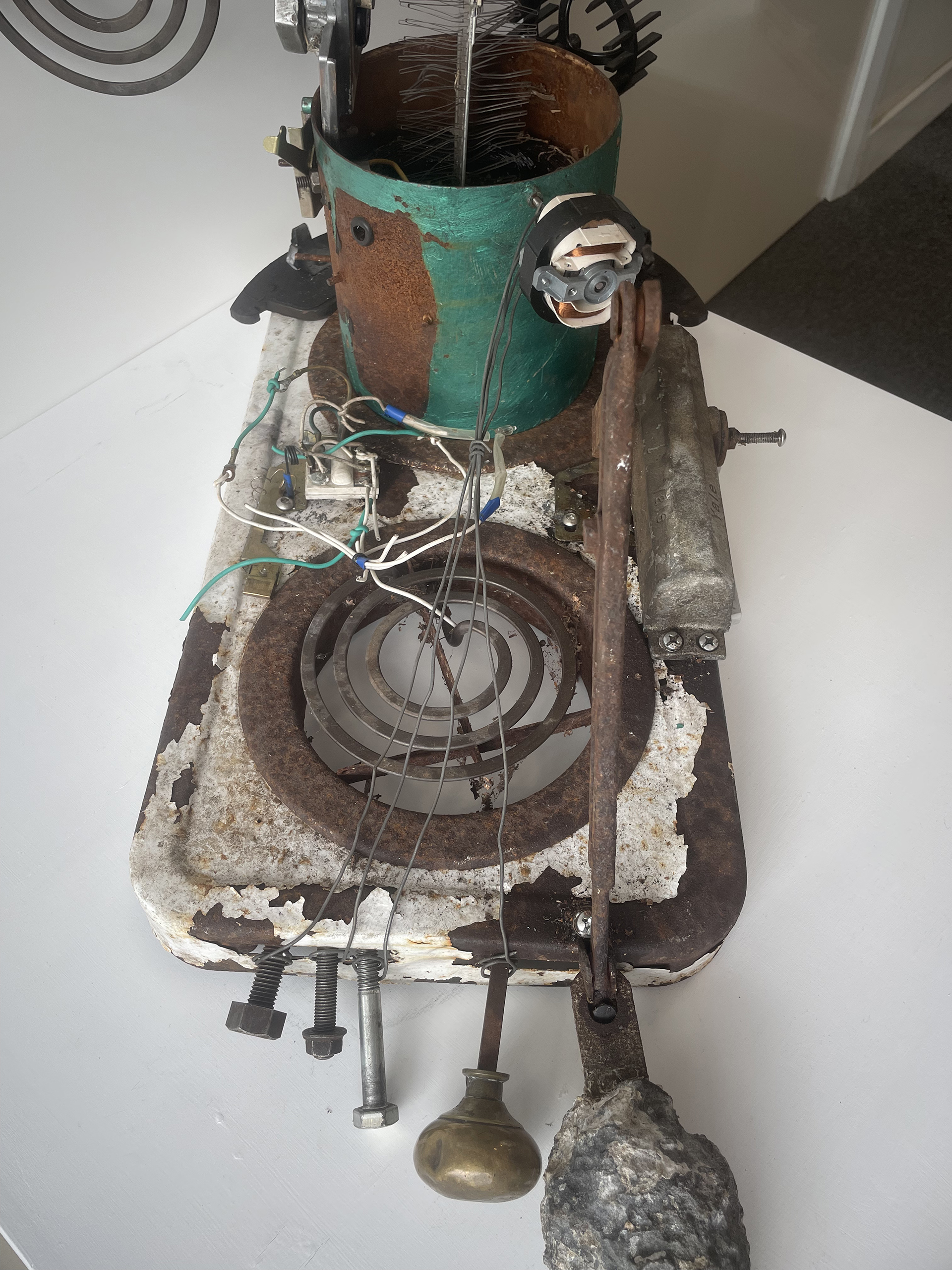 My final piece on my foundation year at the Royal Drawing School: an assemblage sculpture using mainly industrial and mechanical parts. The piece was an experiment in using materiality to evoke the tension and discomfort associated with anxiety, with each object’s former use bringing meaning or metaphor to the body part it was repurposed to represent. I depicted the figure lying down, propped up on one arm, disrupting the usual comfort and relaxation associated with reclining figures, instead focusing on the awkwardness and angular position of the figure.