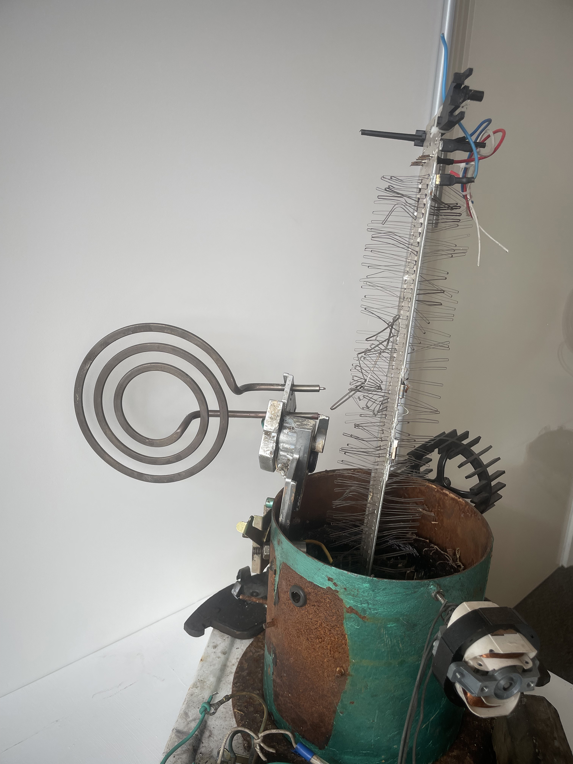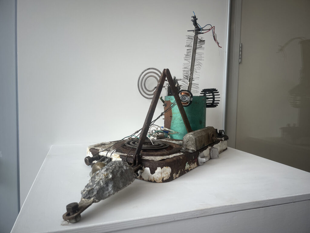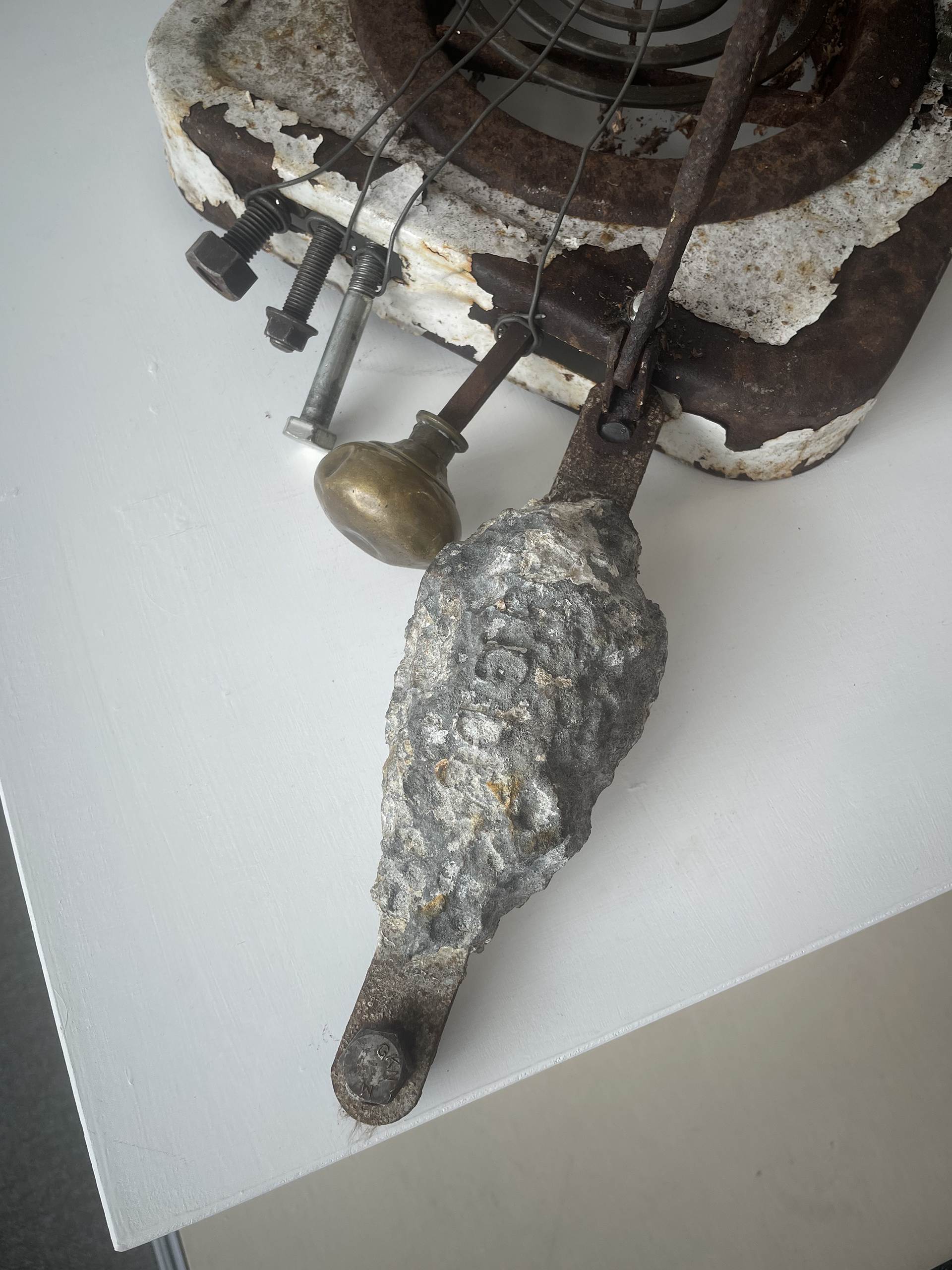 This assemblage sculpture reconfigures deteriorating and discarded scraps into a fleeting form that mimics the human foot. Drawing on Georges Bataille’s essay ‘Big Toe’ and the notion that the foot is a site of both disgust and obsession, the work embodies a paradox of attraction and repulsion—an uncanny structure destined to eventually dissolve back into the junk pile. Bataille used the foot as a metaphor for his theory of ‘baseness’, describing how the foot allows us to stand tall with our heads in the sky, sacrificing itself to remain in the mud. This elevation is echoed in the display of the piece, with this scrap object sitting proudly on a clean white plinth in a protective glass case, elevating what was once sitting in a pile of refuse.